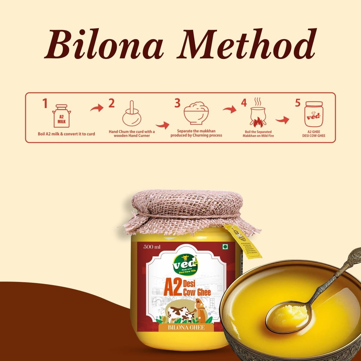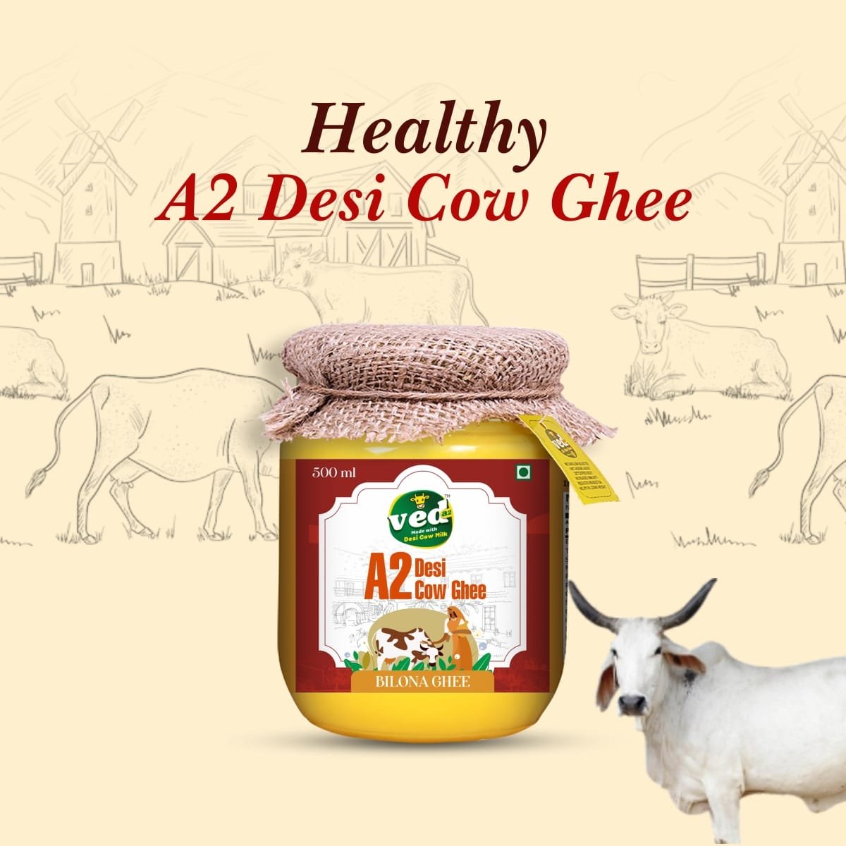 Ved A2 Desi Cow Ghee 500ml is traditionally prepared using the bilona method from the milk of indigenous Desi cows. This time-honoured process involves churning curd to produce ghee with an authentic aroma, rich taste, and smooth texture.