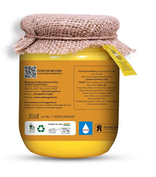 Packed in a glass bottle to maintain freshness and quality, Ved A2 Desi Cow Ghee reflects traditional preparation, careful processing, and a commitment to purity.